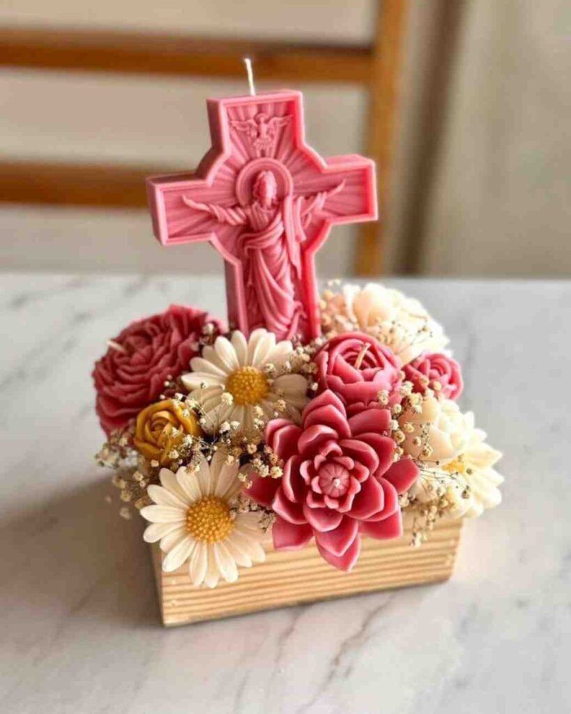 Elegant Floral Cross Candle Arrangement. This beautifully detailed cross-shaped candle surrounded by lifelike floral wax blooms adds a meaningful and elegant touch to your décor. Crafted with care, the pink and cream tones create a soothing and heartfelt display perfect for peaceful corners or spiritual spaces.
