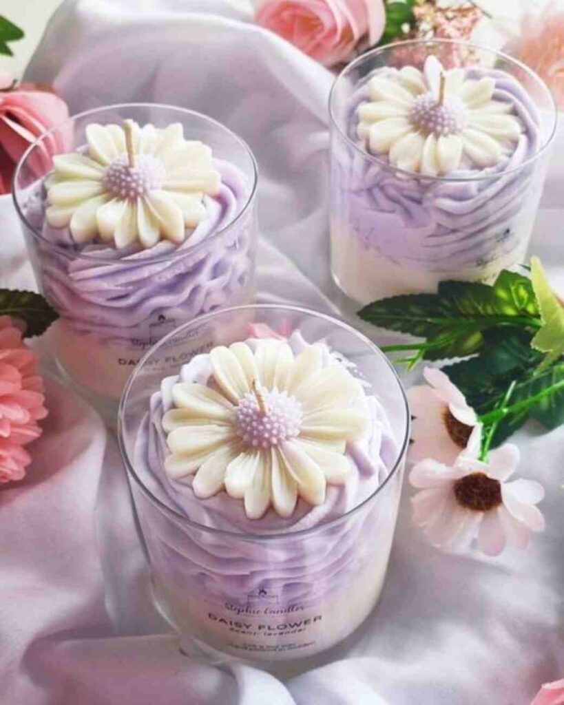 These stunning lavender whipped jar candles look like dreamy floral desserts, blending soft pastel elegance with artisanal charm. Each candle is layered with smooth cream wax at the base, topped with luxurious lavender-whipped wax swirls that resemble delicate frosting.