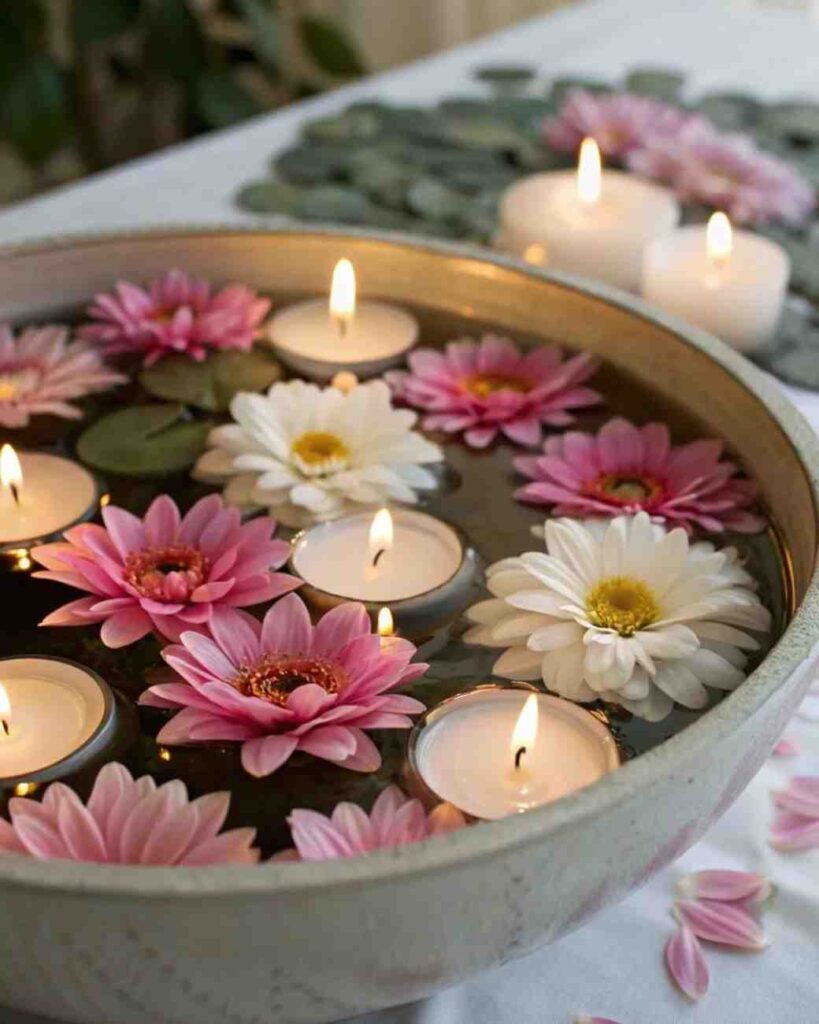 Even though it’s simple, this candle arrangement instantly brightens your home or event.Perfect for festivals, dinners, or relaxation time, floating candles bring a gentle light and a touch of natural beauty to any setting.