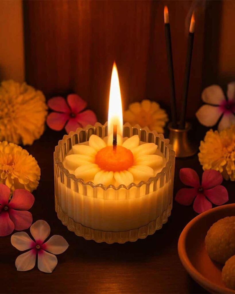 Radiant Daisy Blossom Candle glows like a warm sunset, creating a serene and inviting ambiance. Set in an elegant ribbed glass container, the candle features a beautifully crafted daisy flower with bright white petals and a vibrant yellow center that gently illuminates as it burns. Surrounded by fresh floral accents and soft lighting, it brings a sense of peace, devotion, and festive warmth to any space. most beauty candles like for people and use full candles.