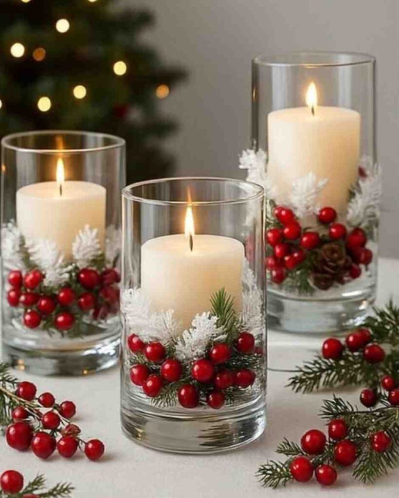Holiday Glass Candle Holders bring a festive charm to any room. Decorated with red berries, pine leaves, and a touch of white frost, they create a cozy and cheerful atmosphere.