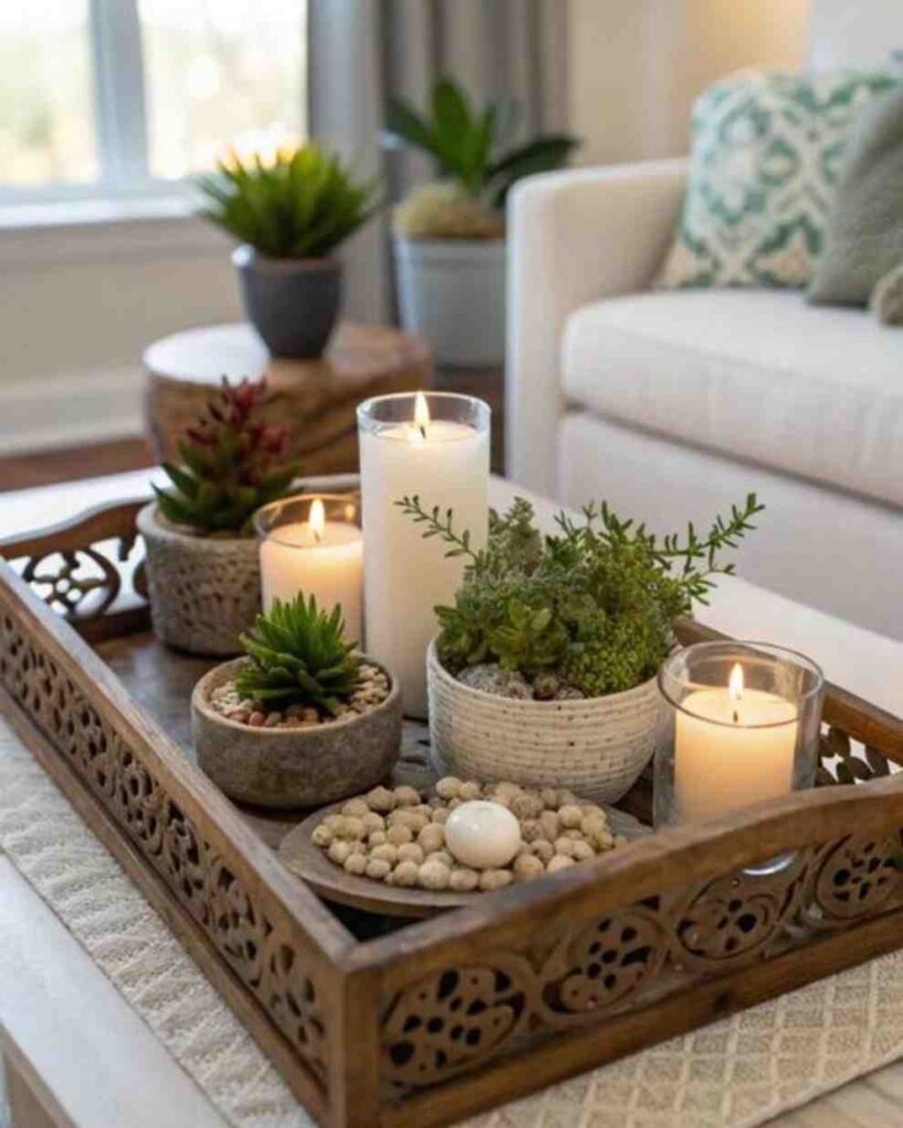 10.Serene Candle Tray Décor with Succulents