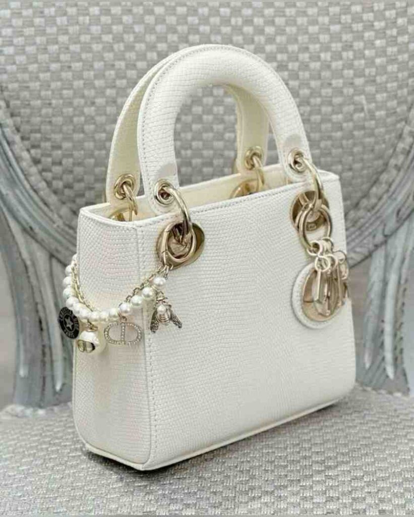 The gold rings and charms on the bag add a pretty touch of shine. The pearl charm chain on the side makes the bag look even more feminine and delicate. These small details give the handbag a luxurious feel without being too flashy.