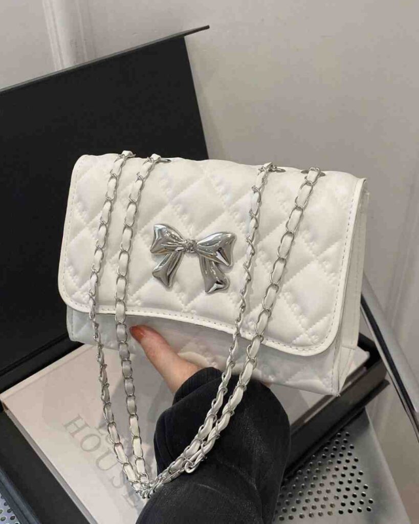 The shiny silver bow on the front adds a cute and stylish touch. It stands out beautifully against the white background and makes the bag look more modern and fashionable. The long silver chain strap gives it a trendy feel and lets you wear it comfortably on the shoulder or crossbody.