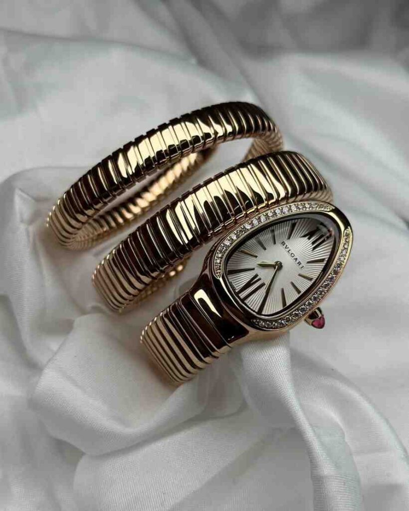 Elegant Gold Serpentine Watch a luxurious gold watch with a unique, coiled bracelet design that wraps beautifully like a serpent. The watch face has a smooth white dial with slim markers, giving it a clean and classy look. The bezel is decorated with small sparkling stones, adding a touch of glamour.