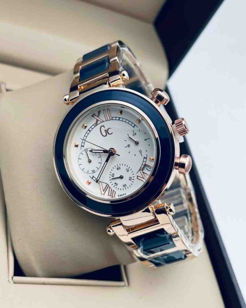 This GC watch features a beautiful mix of rose gold and deep blue, giving it a modern and elegant look. The white dial includes Roman numerals, small sub dials, and gold details that make the design stand out. The bold blue bezel adds a unique touch, making the watch eye catching and classy.