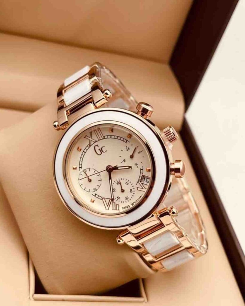 The stylish GC Rose Gold Luxury Watch has a beautiful rose-gold finish that makes it look elegant and high end. The dial is detailed with Roman numerals, small sub-dials, and a clean cream background. The combination of white and rose-gold on the bezel adds a modern, classy touch.