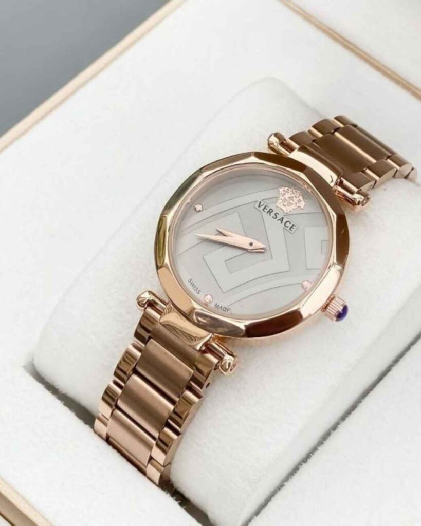 Elegant Rose Gold Versace Ladies Watch features a stunning rose-gold finish that gives it a luxurious and stylish look. The light silver dial has a subtle geometric pattern, along with the iconic Versace logo at the top, making the design unique and elegant. The rose gold hands and markers add a soft shine that enhances the watch’s classy appearance.