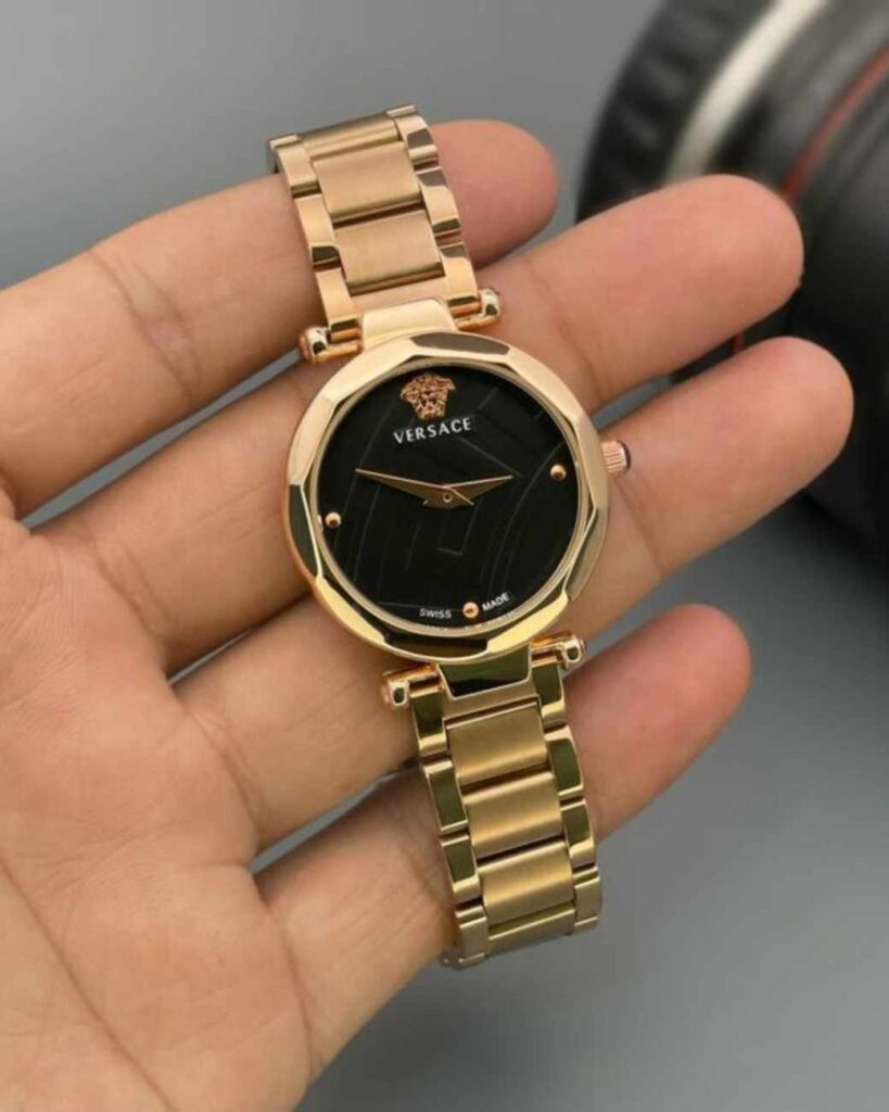 Stylish Black Dial Versace Ladies Watch features a bold black dial paired with a shiny rose gold case, giving it a strong and elegant look. The iconic Versace logo at the top adds a touch of luxury, while the minimal gold markers and hands keep the design clean and modern. The combination of black and rose gold creates a beautiful contrast that makes the watch stand out.