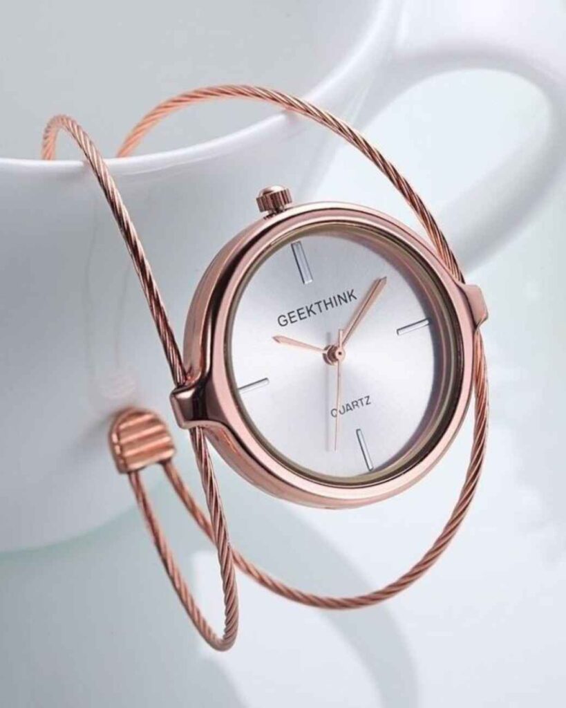 Elegant Rose Gold Wire Bracelet Watch with a unique rose-gold wire bracelet design. The watch has a clean, simple dial with minimal markings, giving it a modern and elegant look. Its rose-gold case adds a warm shine that makes it stand out without being too flashy.