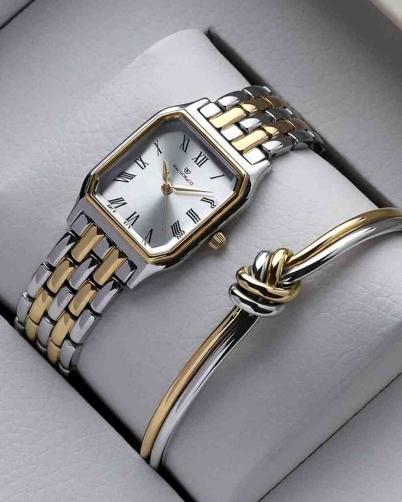 Two Tone Classic Watch paired with a matching knot bracelet. The watch has a rectangular silver dial with Roman numerals, giving it a classic and elegant look. Its band is made of silver and gold links, adding a touch of luxury and making it suitable for both casual and formal wear.