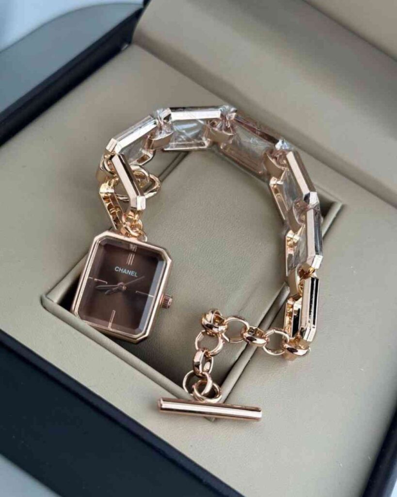 Elegant Chanel Rose Gold Bracelet Watch designed like a bracelet. The watch has a small, rectangular face with a rich brown color and simple hour markers. Its rose-gold tone gives it a soft, classy look.