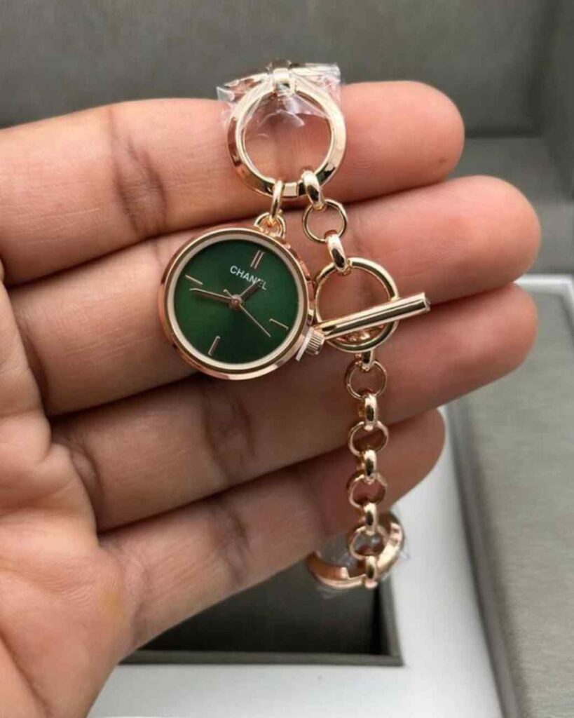 Rose Gold Bracelet Watch Keychain with Green Dial with the charm of a bracelet keychain. The rose-gold metal gives it a warm, sophisticated look, while the deep green dial adds a unique pop of color that stands out.
