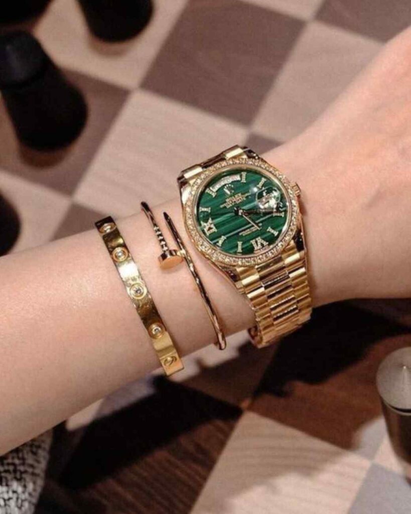 The image shows a wrist adorned with a striking gold watch featuring a rich green dial. The watch has a bold, elegant design with shiny gold details and sparkling accents around the face, giving it a very luxurious appearance. The combination of gold and green creates a classy and eye catching look.