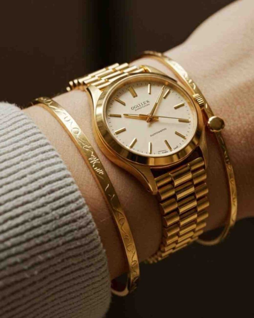 The combination of the watch and bracelets creates a stylish and coordinated look. The warm gold tones stand out beautifully, giving the whole outfit a touch of elegance and sophistication.