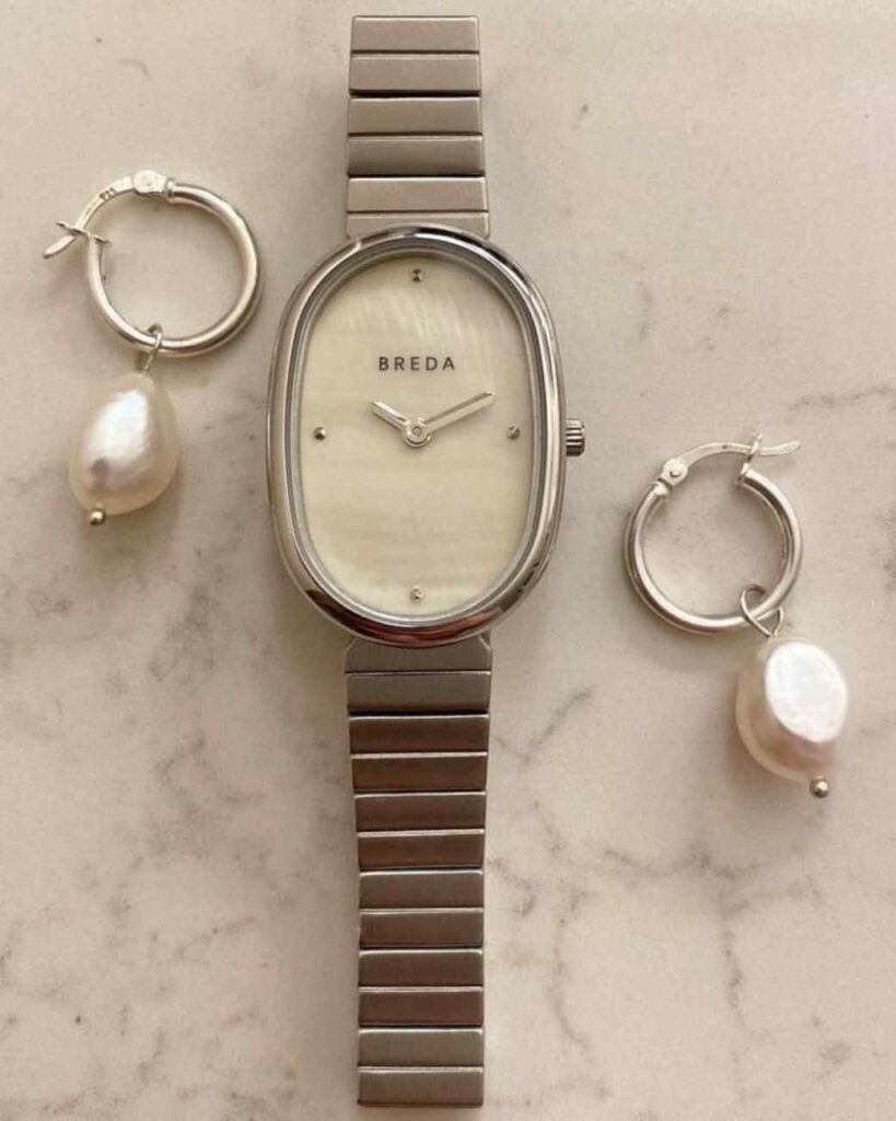Elegant Silver Watch and Pearl Earrings shows a stylish silver watch with an oval face and a smooth metal band. The watch has a clean, simple design with a light-colored dial and the brand name “BREDA” at the top. Its minimal look makes it perfect for everyday wear or special occasions.