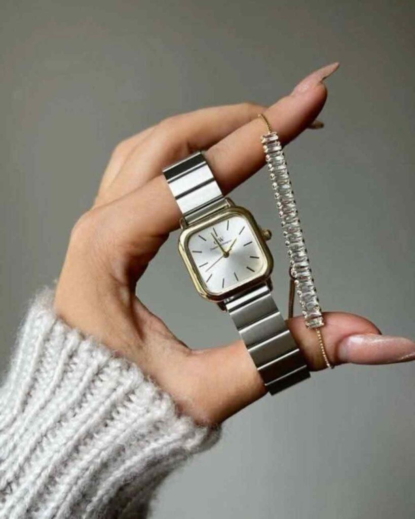 Elegant Silver Wristwatch and Sparkling Bracelet with a square face and gold accents. The watch has a clean white dial with simple hour markers, giving it a modern and elegant look. The metal strap adds a polished and timeless feel.