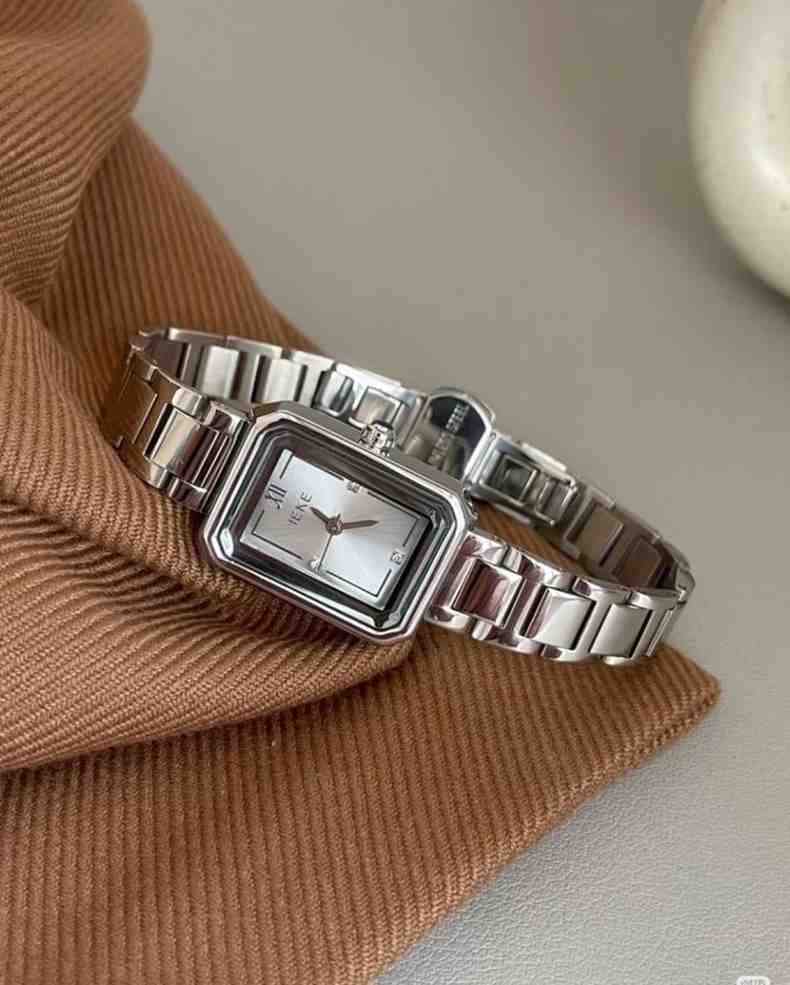 Sleek Silver Rectangle Watch features a clean rectangular dial with a soft silver finish that gives it a modern and elegant look. The simple markers and slim hands make it easy to read while keeping the design minimal.The silver metal band has a polished shine and a smooth, sturdy feel.