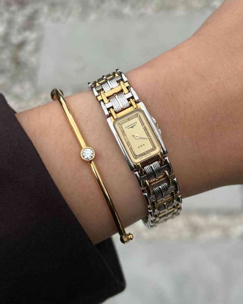 The band is a mix of silver and gold, creating a beautiful two-tone style that feels both modern and classic. It sits comfortably on the wrist and pairs well with other jewelry.