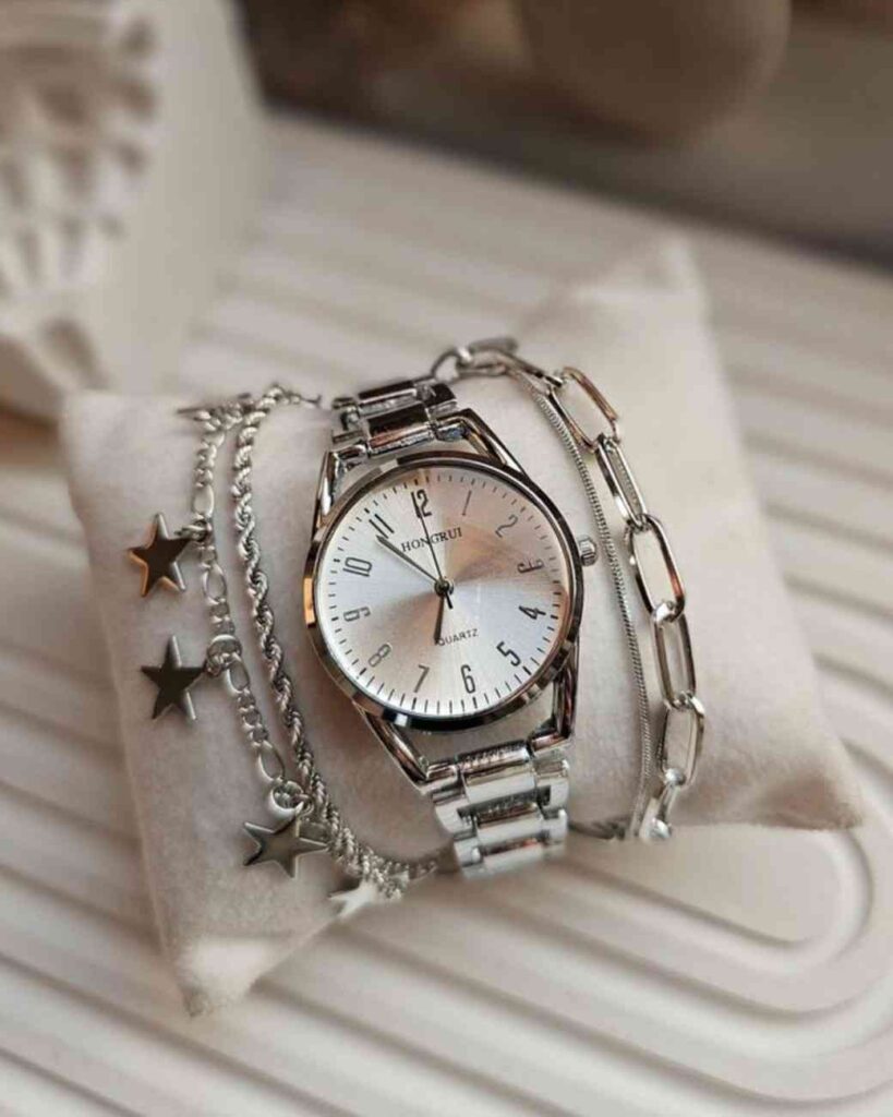 5.Elegant Silver Wristwatch and Sparkling Bracelet