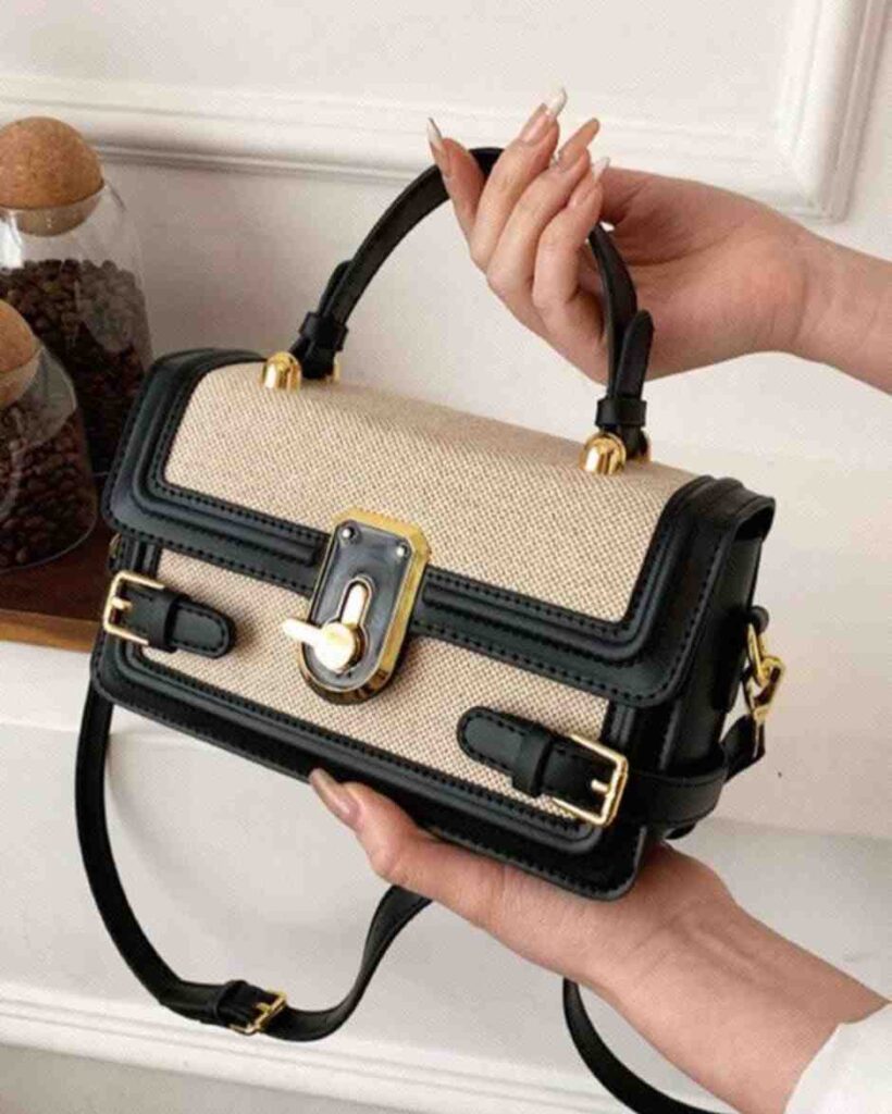 The classic beige and black handbag looks elegant with its neat design and golden lock detail. It is stylish yet simple, making it perfect for daily use or small outings. The size feels just right to carry essentials comfortably while still looking classy.